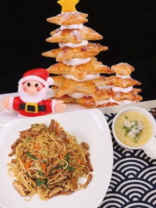 全日制E班:(蟹肉粟米羹+肉絲香菇炒拉麵+聖誕樹造型奶油酥皮配翻糖皮聖誕老人裝飾)