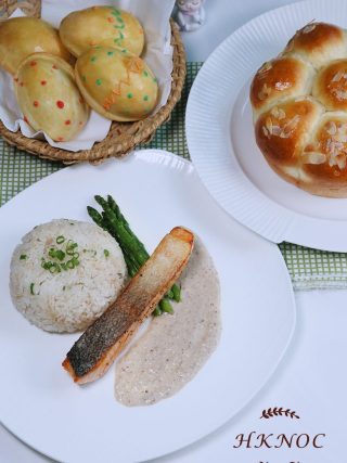 小廚神全日制Menu E:(前菜:手工甜餐包 主菜:煎脆皮三文魚柳配蘑菇忌廉汁/蔥花牛油炒飯 主菜:粟米雞批復活節特別版)