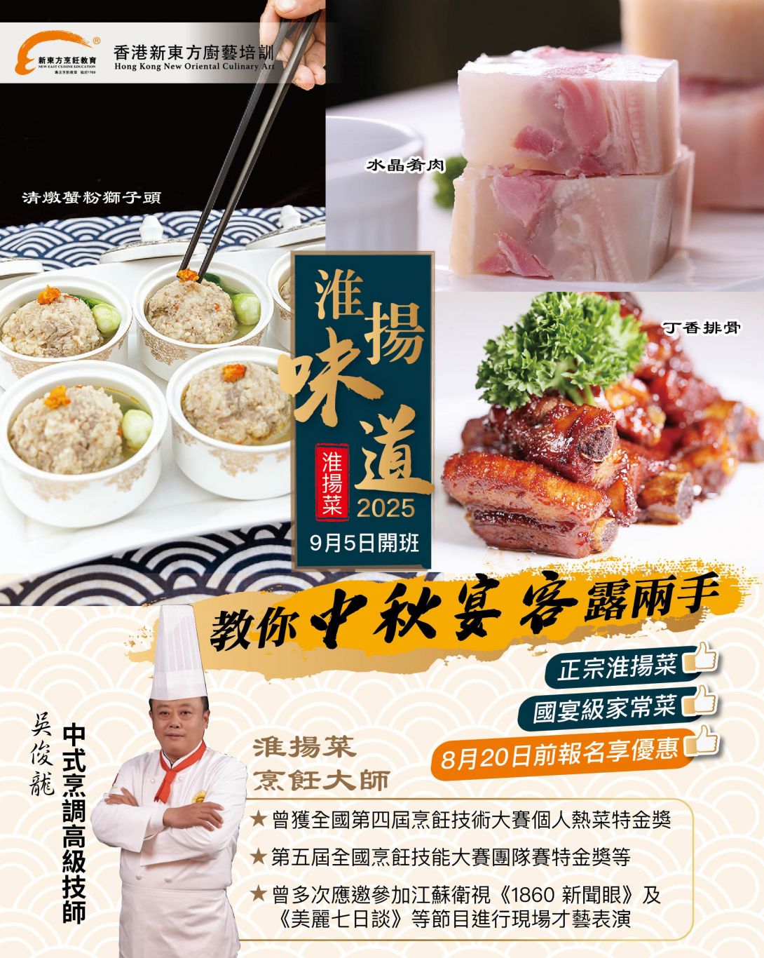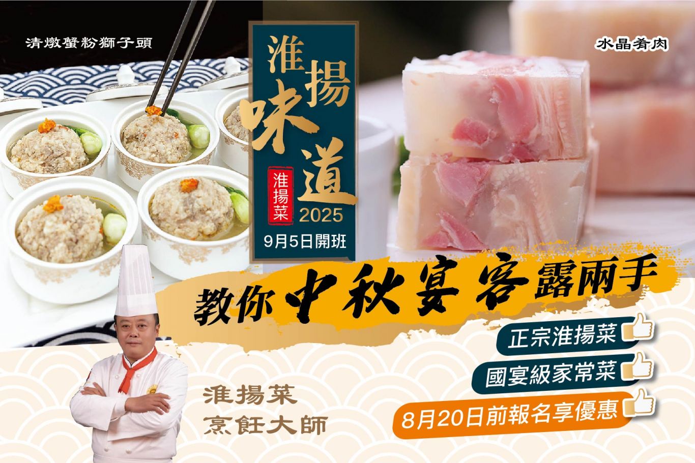 八寶全雞:八寶全鴨的變奏菜式,脫骨後填入糯米、香菇、乾貝等八種配料,製作需要經過多道工序,是道充滿儀式感的菜餚。課堂將演示拆骨技巧,讓家常飯菜呈現出華麗口感。