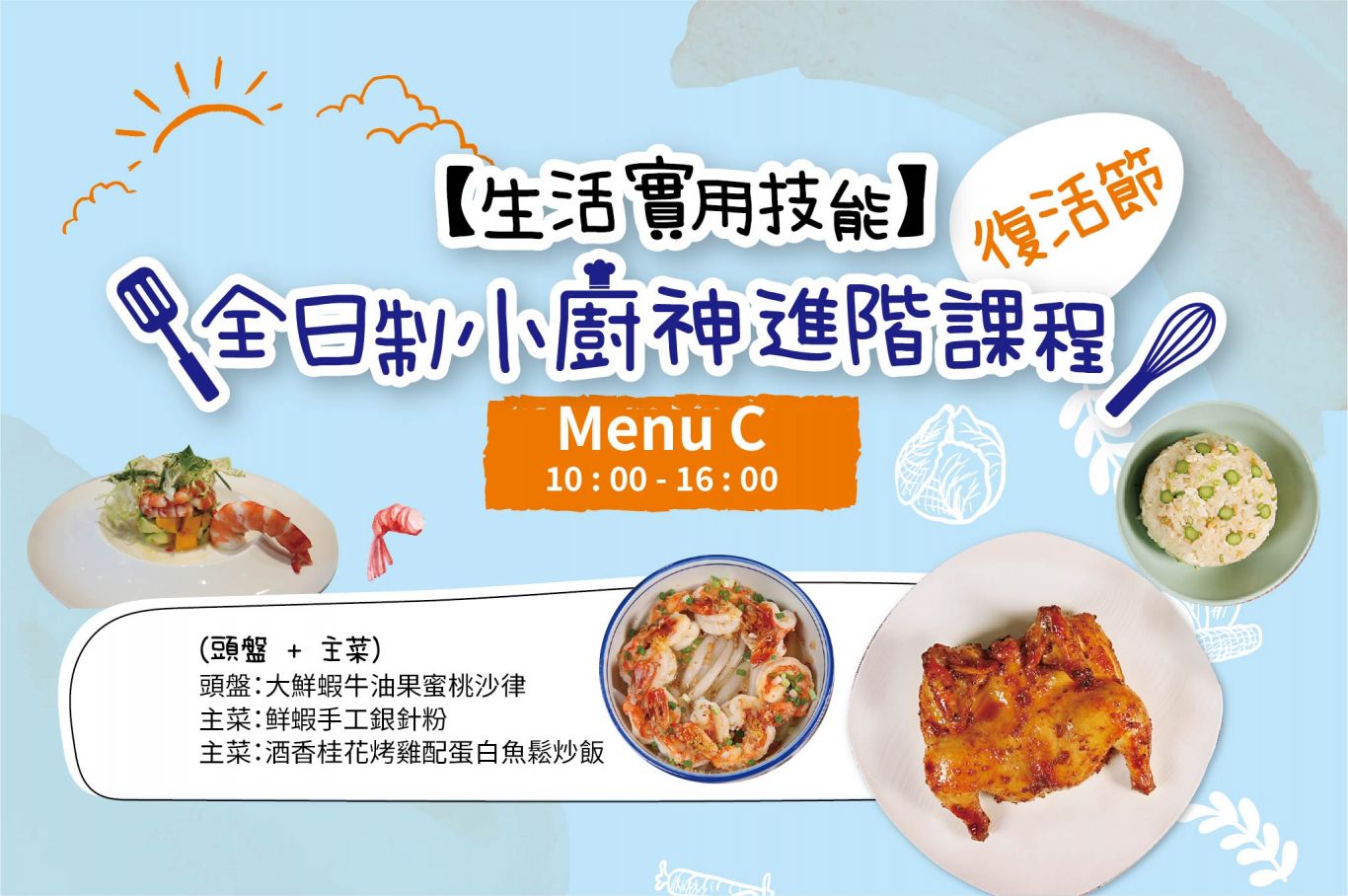 時間︰4月6日 10 : 00 – 16 : 00 1. 頭盤:大蝦芒果蟹肉水餅 (示範及合作式烹調) 2. 主菜:傳統卡邦尼意粉 3. 甜品:復活小雞忌廉卷蛋