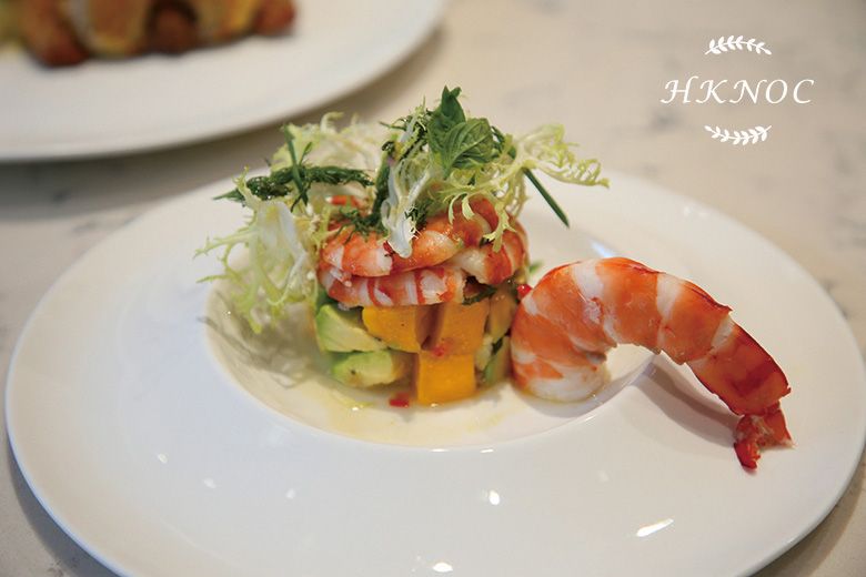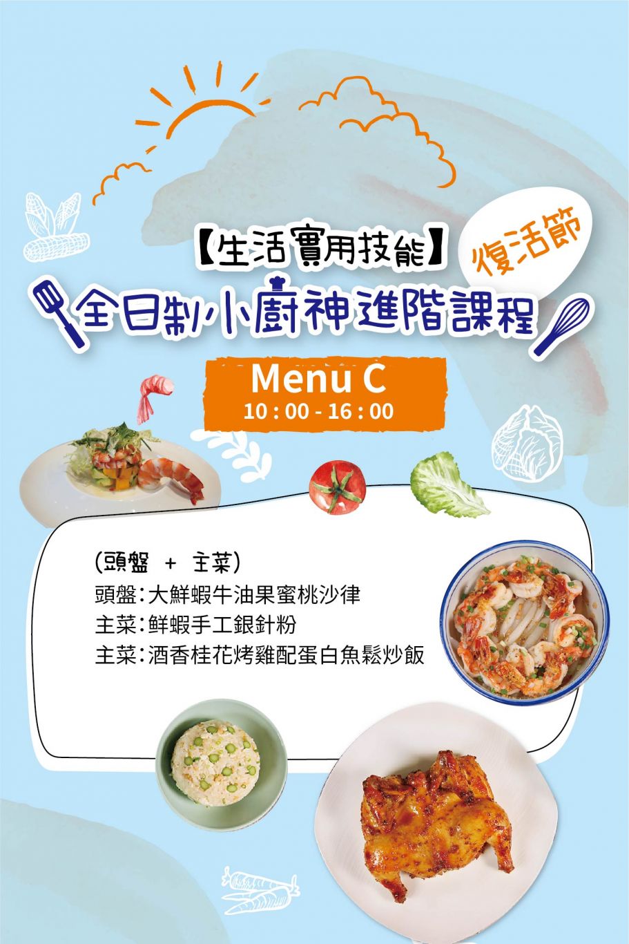 小廚神全日制Menu C:(前菜:鮮蝦牛油果蜜桃沙律 主菜:鲜蝦手工銀針粉 主菜:酒香桂花烤雞配蛋白魚鬆炒飯)