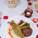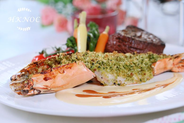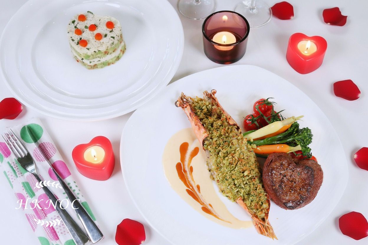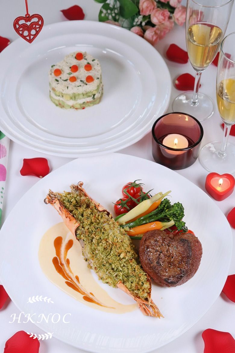 情人節餐:蒜香焗大蝦拼香草牛油煎心形牛柳 + 心形蟹肉牛油果沙律塔