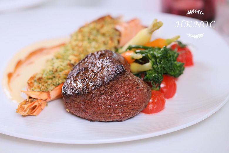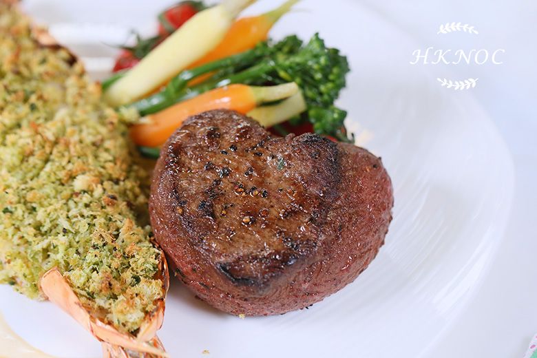 主菜:蒜香焗大蝦拼香草牛油煎心形牛柳