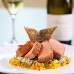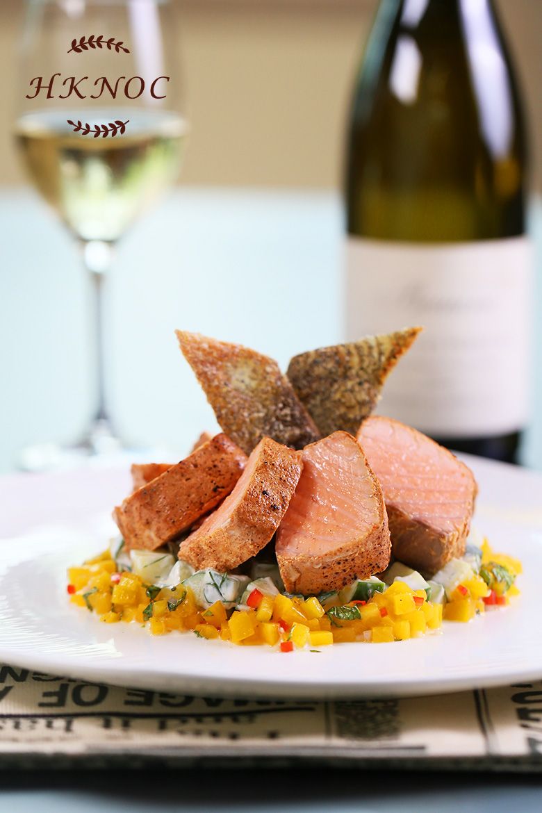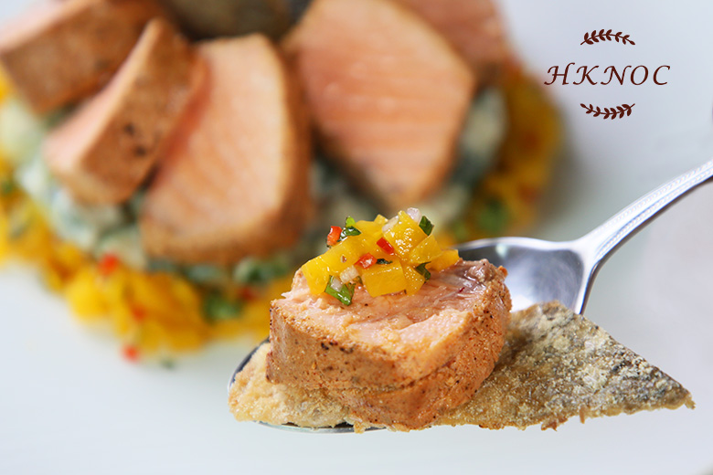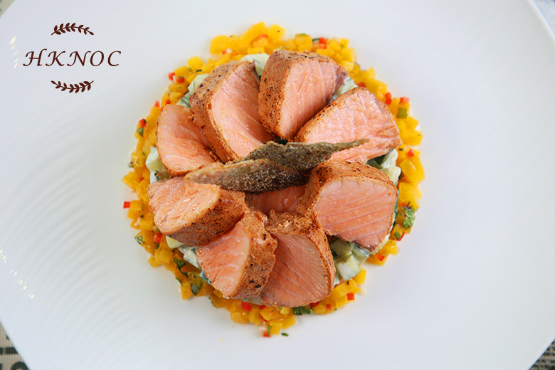火焰燒香辣三文魚柳配青瓜乳酪沙律及蜜桃醬汁