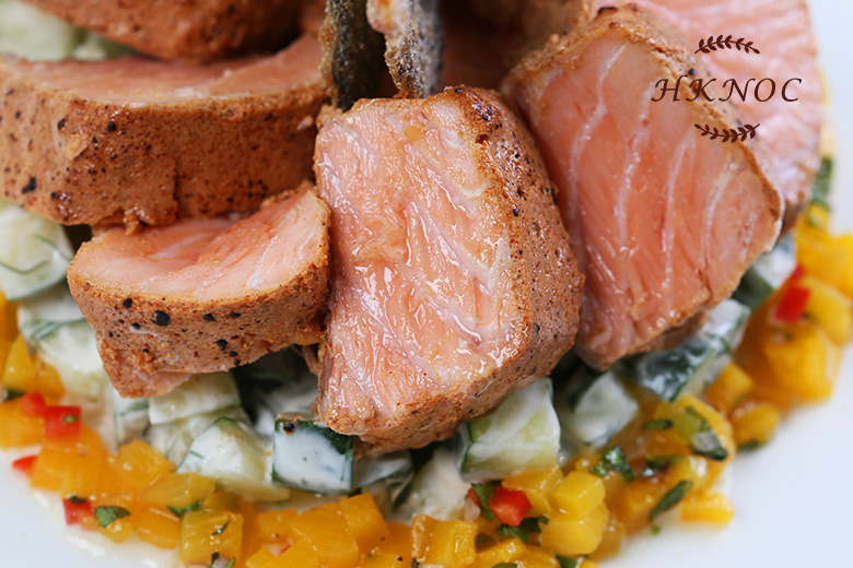 學習燒烤加上慢煮技術,把糖心三文魚烹飪處理發揮極至,再配清新口味配菜,有耳目一新的感覺。