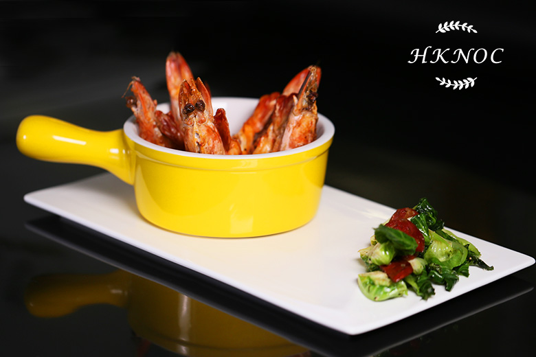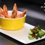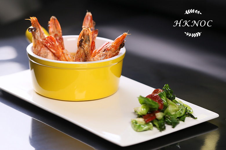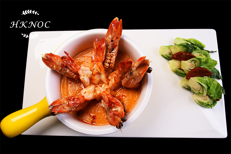 煎大蝦配辣蕃茄醬及辣肉腸炒椰菜