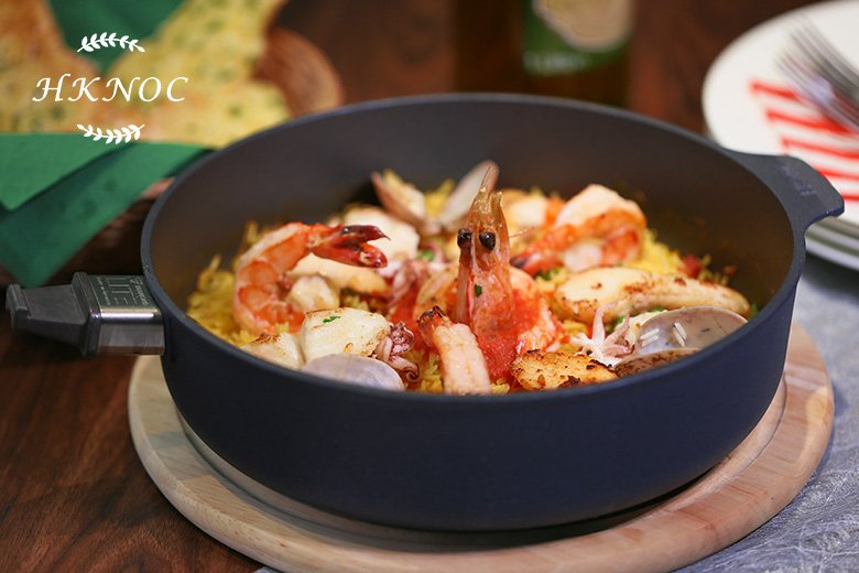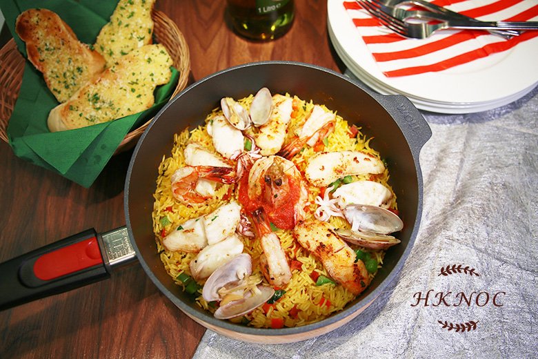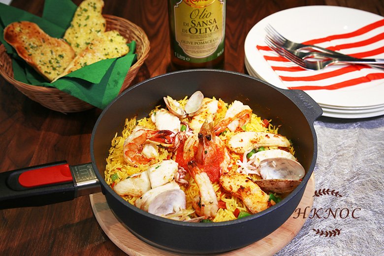 紅花辣肉腸海鮮飯配蒜蓉法包
