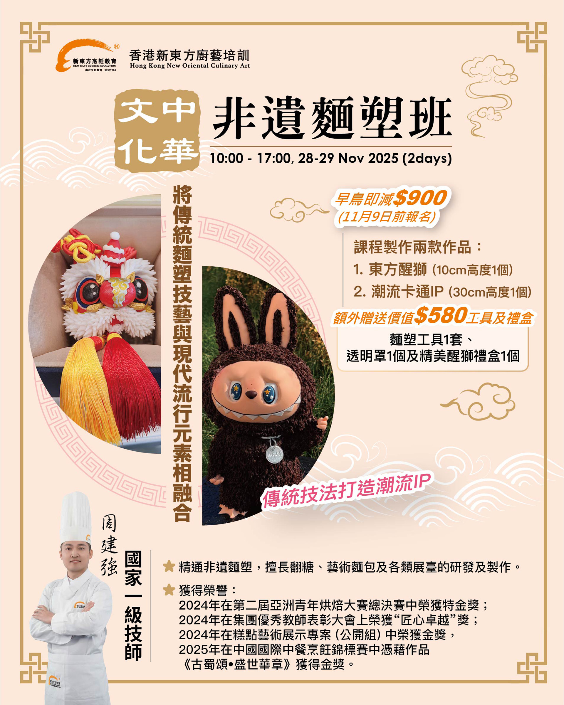 本課程將傳統面塑技藝與現代流行元素相融合,指導學員完成“Labubu”及“東方醒獅”兩款作品。醒獅造型可作車內掛飾、伴手禮或藝術擺件,兼具觀賞性與禮品價值。本工作坊亦適合初學者參加,在專業導師指導下,可自由創作卡通角色、動物或自創造型,體驗傳統工藝的獨特魅力。