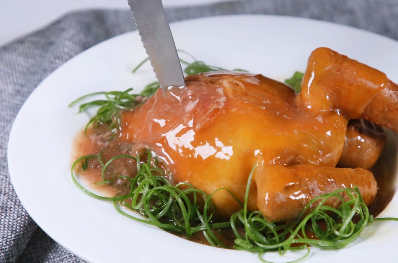 食材講求、優質魚翅、瑤柱及高湯,不加鹽糖以保留原味,以鴿頸綁實封口,燉煮約2小時而成。