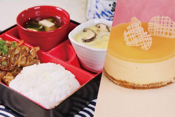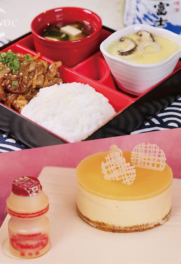 全日制F班:(茶碗蒸蛋配麵豉湯 + 醬汁香蔥炒肉片便當盒 + 益力多芝士蛋糕)