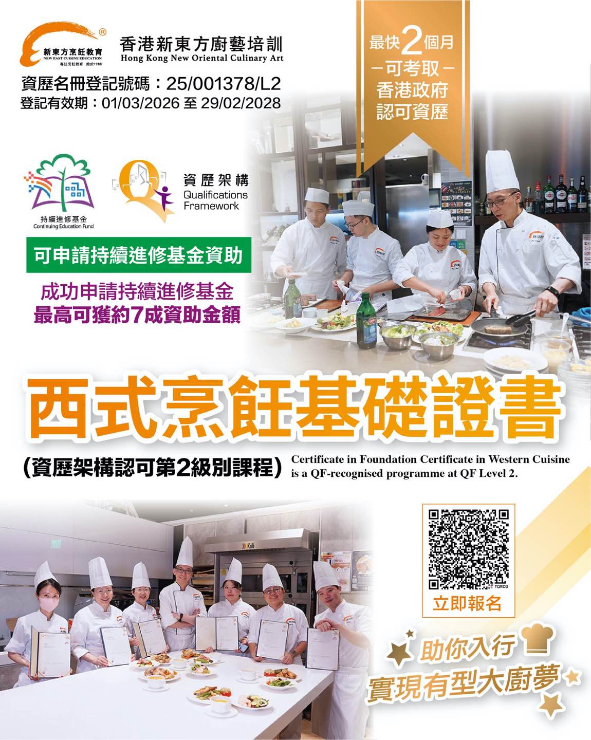 主要針對市場上西式餐廳的基本食品製作及操作知識。課程涵蓋基本西式烹調技巧、菜單設計、成本計算、和食物安全及衛生理論知識,為有志從事餐飲行業或廚藝工作的學生或在職人士提供培訓,教授傳統及當代廚藝知識。協助學員投身飲食行業,或升讀其他烹飪課程。